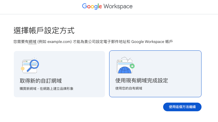 如擁有自己的 Domain (不是 @gmail.com) 的自有 Domain,請選擇右邊「使用現有網域完成設定」