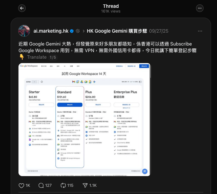 小弟早前在 2025 年 9 月於 Threads 分享,香港朋友如何透過 Subscribe Google Workspace 用到近期大熱的 Gemini (包括2025年11月18日最新推出的 Gemini 3.0 Pro 和 NanoBanana Pro),無需 VPN,無需外國信用卡都得。