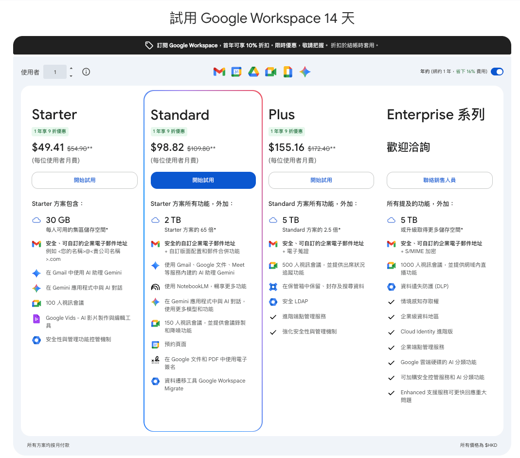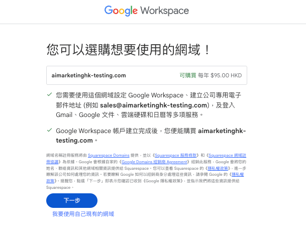 到 Workspace 官網選擇合適方案(Business Starter / Standard / Plus / Enterprise 等),用你的新網域註冊,並按指示在 DNS 驗證網域擁有