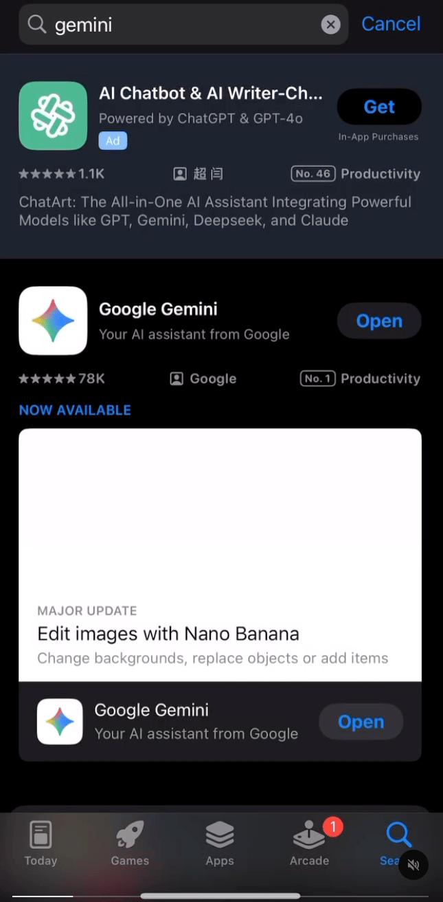 建立一個海外 Apple ID(例如美國 / 台灣地區),使用該帳號登入 App Store。切換到新帳號後,在 App Store 搜尋 Gemini App,若該地區支援就可以下載。