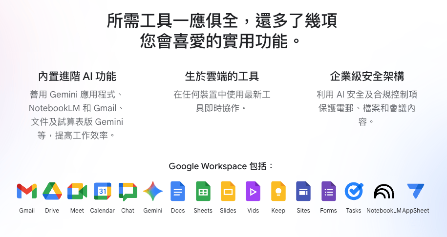 針對 Business / Enterprise / Education 等組織方案的 AI 加購服務,可以直接在 Gmail、Docs、Sheets、Slides、Meet 裡用 Gemini 功能。香港企業/個人如果用 Workspace,只要方案支援同有合資格網域,就可以正式免 VPN 使用。